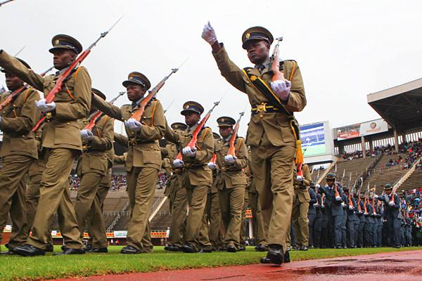 2015年4月18日,在中國援建的津巴布韋國家體育場內(nèi),津國防軍進(jìn)行表演。(新華社發(fā),費列蒙攝)