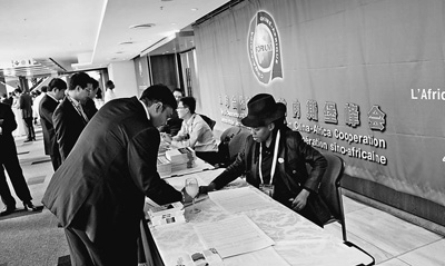3日,印有中非合作論壇徽標,用中、英、法三種文字書寫的“中非合作論壇約翰內斯堡峰會”及主題詞“中非攜手并進:合作共贏、共同發(fā)展”的巨幅招貼畫,將約堡桑頓會議中心裝點出一番全新的意境。