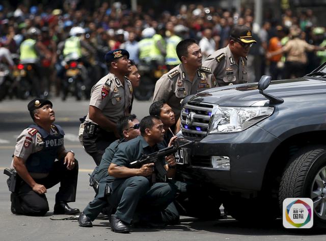 1月14日,在印度尼西亞首都雅加達(dá),警察持槍隱蔽在一輛汽車(chē)后。雅加達(dá)市中心14日上午發(fā)生多起爆炸,警方同武裝分子發(fā)生交火。新華社/路透