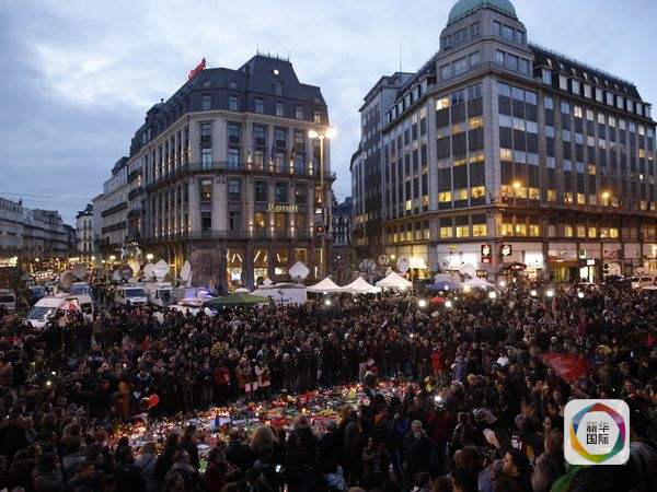 布魯塞爾,數(shù)百民眾圍聚在廣場(chǎng)上,悼念恐襲遇難者。(圖片來(lái)源:新華/法新)