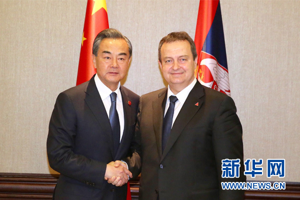 6月17日,中國外交部長王毅(左)在貝爾格萊德應(yīng)約會見塞爾維亞第一副總理兼外長達(dá)契奇。 新華社記者丁林?jǐn)z
