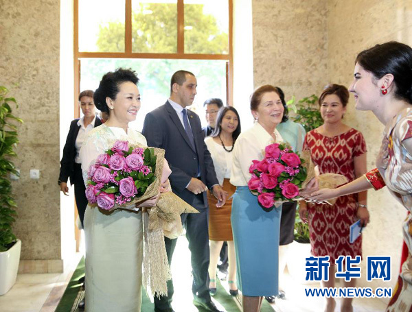 當(dāng)?shù)貢r(shí)間6月22日下午,國家主席習(xí)近平夫人彭麗媛同烏茲別克斯坦總統(tǒng)卡里莫夫夫人卡里莫娃共同參觀塔什干孔子學(xué)院。這是孔子學(xué)院學(xué)生向彭麗媛和卡里莫娃獻(xiàn)花。新華社記者丁林?jǐn)z
