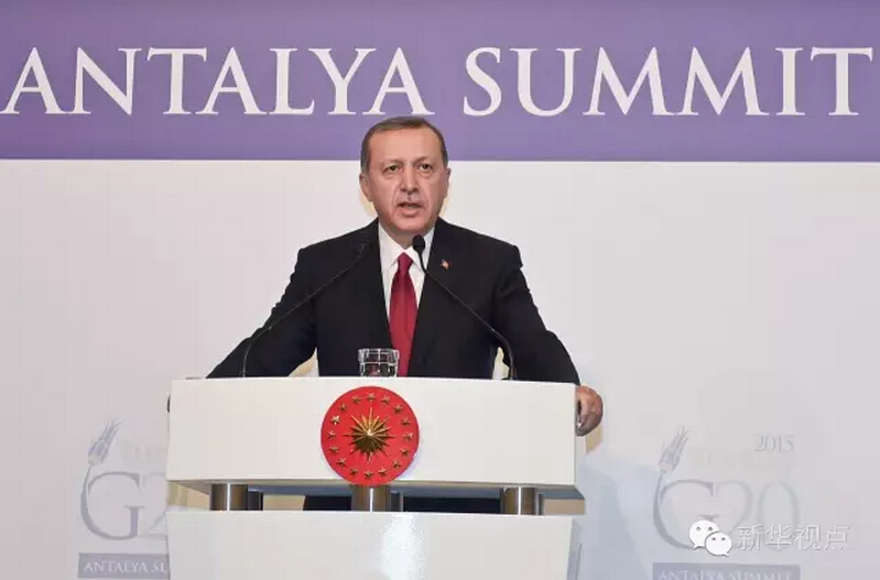 ??? 2015年11月,G20峰會(huì)在土耳其安塔利亞舉行,從安塔利亞到杭州,從地中海岸到錢塘江畔,與東道主接力棒一樣順利傳遞的,是對推動(dòng)全球經(jīng)濟(jì)穩(wěn)步復(fù)蘇、實(shí)現(xiàn)可持續(xù)增長的決心?!敖影簟焙蟮闹袊?,在議題設(shè)置上既汲取了安塔利亞峰會(huì)的智慧成果,又著眼當(dāng)前、旨在長遠(yuǎn)、彰顯新意。 2015年G20安塔利亞峰會(huì)上的埃爾多安總統(tǒng)↓