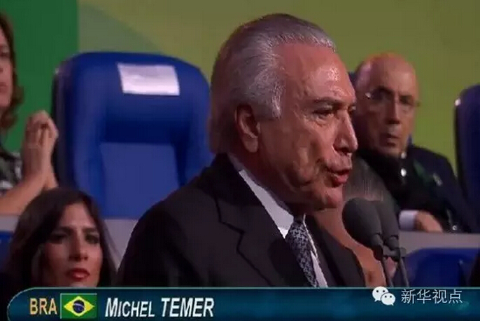 ??? 值得一提的是,出席杭州峰會(huì)的特梅爾,奧運(yùn)會(huì)時(shí)的身份還是代總統(tǒng),當(dāng)?shù)貢r(shí)間8月31日,特梅爾正式就任巴西總統(tǒng),杭州峰會(huì)成為他就職后出席的首個(gè)國際會(huì)議。 里約奧運(yùn)會(huì)開幕式上的特梅爾↓