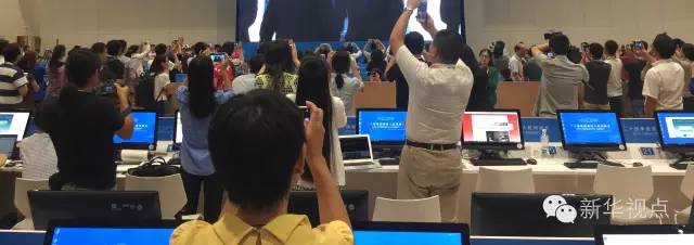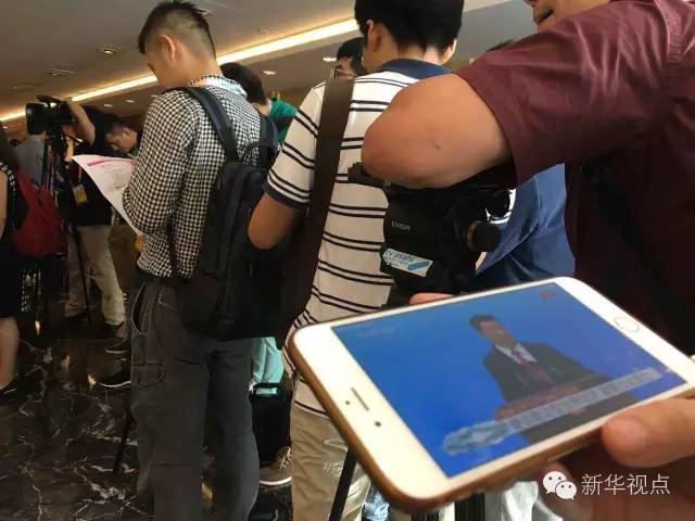 由于峰會(huì)現(xiàn)場(chǎng)場(chǎng)地有限,許多記者無(wú)法到會(huì)場(chǎng)實(shí)地進(jìn)行采訪報(bào)道。不愿錯(cuò)過(guò)精彩瞬間的他們架起“長(zhǎng)槍短炮”,對(duì)準(zhǔn)新聞中心內(nèi)正在直播開(kāi)幕式實(shí)況的大屏幕。