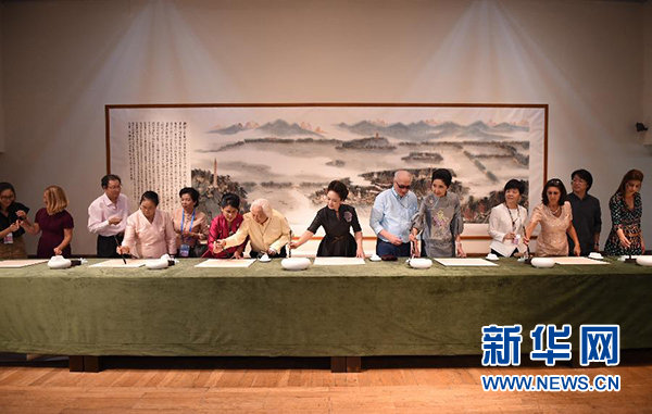 9月5日,國家主席習近平夫人彭麗媛邀請出席二十國集團領(lǐng)導人杭州峰會外方代表團團長夫人參觀中國美術(shù)學院。這是彭麗媛與來賓一同書寫漢字“和”。新華社記者 謝環(huán)馳 攝