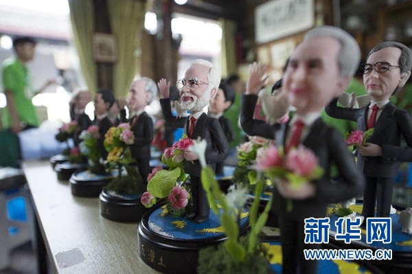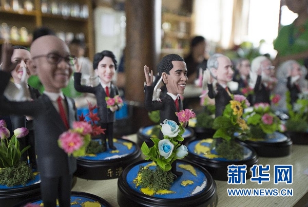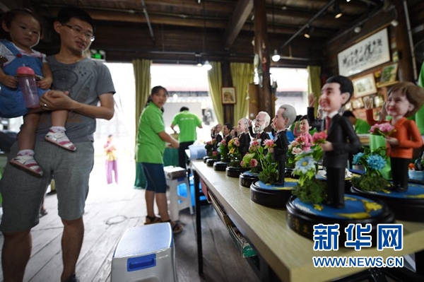 9月1日,手工藝人吳小莉創(chuàng)作的捏塑作品G20杭州峰會參會領(lǐng)導(dǎo)人形象在杭州京杭大運河畔的橋西歷史街區(qū)擺放展示。新華社記者 鞠煥宗 攝