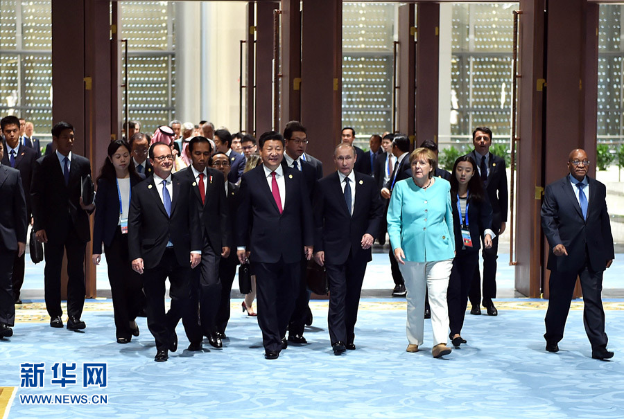 ??? 9月4日,二十國集團(tuán)領(lǐng)導(dǎo)人第十一次峰會(huì)在杭州國際博覽中心舉行。國家主席習(xí)近平主持會(huì)議并致開幕辭。這是二十國集團(tuán)成員和嘉賓國領(lǐng)導(dǎo)人、有關(guān)國際組織負(fù)責(zé)人步入會(huì)場。新華社記者李濤攝