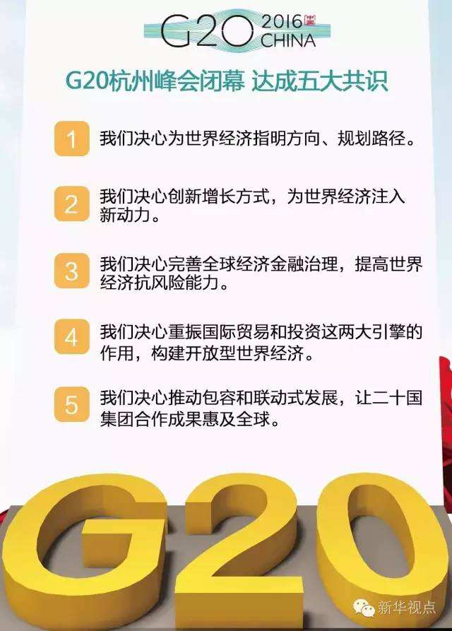 從4日下午,習(xí)近平主席敲下木槌,宣布峰會(huì)開幕,至5日下午峰會(huì)閉幕。一天半的時(shí)間,領(lǐng)導(dǎo)人在峰會(huì)上圍繞會(huì)議主題和重點(diǎn)議題進(jìn)行了熱烈而富有成果的討論,就加強(qiáng)政策協(xié)調(diào)、創(chuàng)新增長(zhǎng)方式,全球經(jīng)濟(jì)金融治理,國際貿(mào)易和投資,包容和聯(lián)動(dòng)式發(fā)展等議題,以及影響世界經(jīng)濟(jì)的其他突出問題,深入交換看法,達(dá)成許多重要共識(shí)。