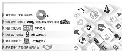 專家預(yù)測,到2050年全球能源互聯(lián)網(wǎng)初步建成時,清潔能源比重將達到80%,每年可替代相當(dāng)于240億噸標(biāo)準煤的化石能源,減排二氧化碳670億噸。屆時,全球溫升控制在2攝氏度以內(nèi)的目標(biāo)有望實現(xiàn)。這一發(fā)展低碳經(jīng)濟、實現(xiàn)能源變革轉(zhuǎn)型的系統(tǒng)性解決方案,贏得潘基文、世界銀行行長金墉、美國能源部長莫尼茲等的高度贊賞和積極支持。