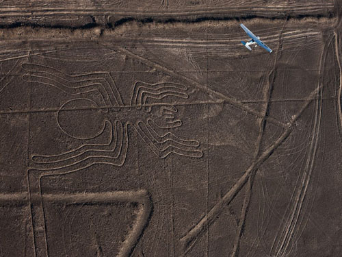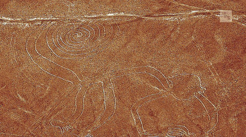 ????站在地面上的話,你幾乎看不到納斯卡線,它們由淺色泥土畫成,兩邊由深色石頭畫的線來提亮。這個地區(qū)有數(shù)量眾多的納斯卡線——長達幾千米的碎片狀的三角形和矩形,非寫實的動物和鳥類圖案:一只猴子,一只禿鷹,一只完全對稱的蜘蛛,一只蜂鳥。