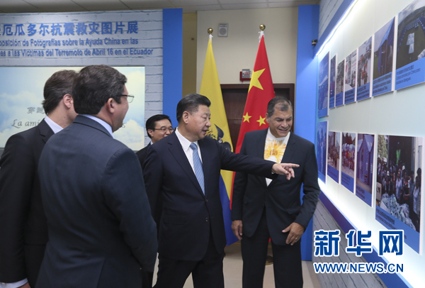 當(dāng)?shù)貢r(shí)間11月18日,國(guó)家主席習(xí)近平在基多同厄瓜多爾總統(tǒng)科雷亞共同出席中方援建的厄瓜多爾公共安全應(yīng)急指揮中心聯(lián)合實(shí)驗(yàn)室揭牌儀式,喬內(nèi)醫(yī)院奠基、科卡科多-辛克雷水電站竣工發(fā)電視頻連線活動(dòng)。這是兩國(guó)元首共同參觀中方支援厄瓜多爾抗震救災(zāi)圖片展。新華社記者 蘭紅光 攝