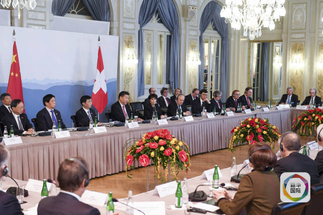 1月16日,國(guó)家主席習(xí)近平在伯爾尼同瑞士聯(lián)邦主席洛伊特哈德共同會(huì)見瑞士經(jīng)濟(jì)界代表。(新華社記者李學(xué)仁攝)