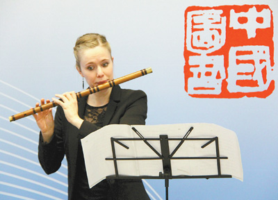 1月11日,在瑞士蘇黎世大學(xué),一名當(dāng)?shù)貙W(xué)生在“中國圖書中心”揭幕儀式上表演笛子獨(dú)奏。
