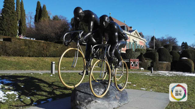 洛桑奧林匹克博物館公園對(duì)面湖邊便道上的雕塑。新華社記者高鵬攝