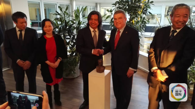 1月16日國(guó)際奧委會(huì)主席巴赫與來(lái)訪(fǎng)的中國(guó)雕塑家吳為山合影留念。新華社記者高鵬攝