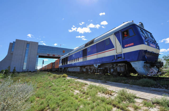 2016年8月27日,一列中歐班列貨運(yùn)列車駛出二連浩特國門。(新華社記者 連振攝)
