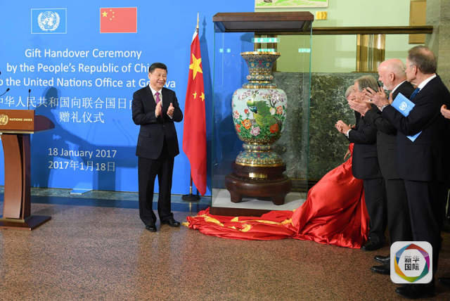 1月18日,國(guó)家主席習(xí)近平在瑞士日內(nèi)瓦萬(wàn)國(guó)宮出席“共商共筑人類(lèi)命運(yùn)共同體”高級(jí)別會(huì)議,并發(fā)表題為《共同構(gòu)建人類(lèi)命運(yùn)共同體》的主旨演講。這是會(huì)議結(jié)束后,習(xí)近平出席中國(guó)向聯(lián)合國(guó)日內(nèi)瓦總部贈(zèng)禮儀式。(新華社記者張鐸攝)