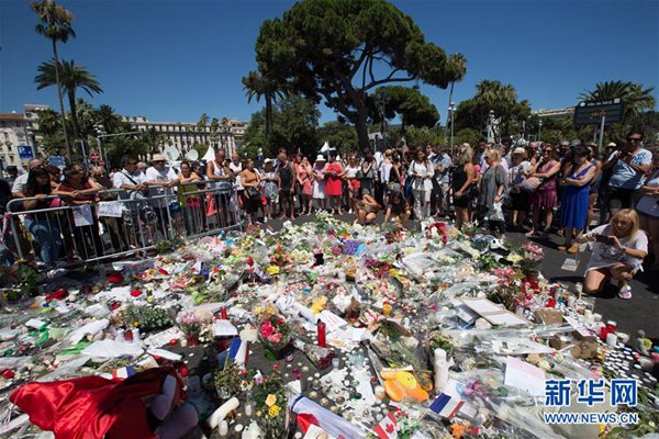 7月16日,在法國(guó)南部城市尼斯,人們聚集在恐怖襲擊發(fā)生地英國(guó)人漫步大道悼念遇難者。新華社記者 徐金泉 攝