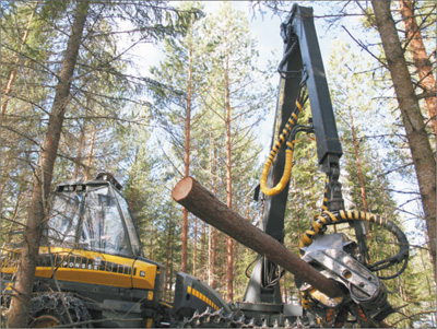 登上伐木機(jī),我們看到一個(gè)顯示屏上不斷變化著各種數(shù)字。原來機(jī)械手由電腦控制,能測算出所伐下樹木的各項(xiàng)數(shù)據(jù),如果直徑超過16厘米就送到鋸木廠,反之只能做紙漿。砍下的樹木要100%利用:制漿后的廢料如樹皮、漿渣可燃燒,用作造紙能源。木材加工及膠合板生產(chǎn)所產(chǎn)生的廢料木屑則作為漿廠的原料。
