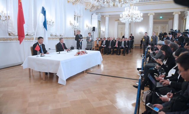 4月5日,國家主席習(xí)近平在赫爾辛基同芬蘭總統(tǒng)尼尼斯托舉行會談。(新華社記者張鐸攝)