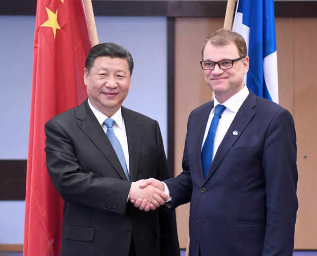 4月5日,國家主席習(xí)近平在赫爾辛基會見芬蘭總理西比萊。(新華社記者張鐸攝)