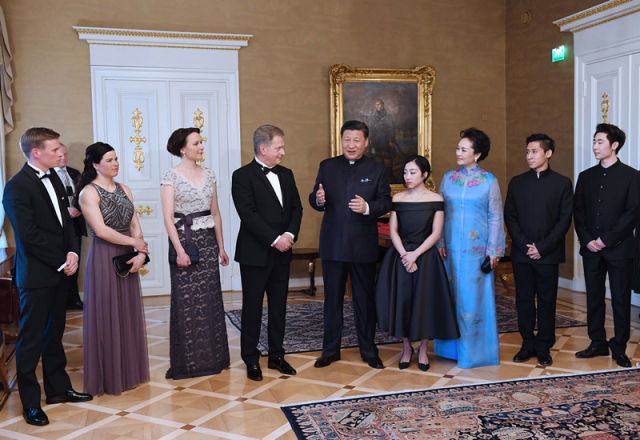 當(dāng)?shù)貢r間4月5日晚,國家主席習(xí)近平和芬蘭總統(tǒng)尼尼斯托在赫爾辛基共同會見剛剛參加完2017年世界花樣滑冰錦標(biāo)賽的中芬兩國冰雪運(yùn)動員代表。習(xí)近平夫人彭麗媛和尼尼斯托夫人豪吉歐參加會見。(新華社記者饒愛民攝)