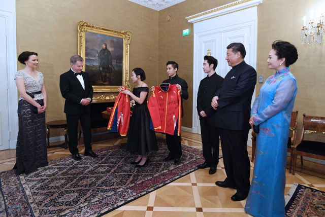 當(dāng)?shù)貢r間4月5日晚,國家主席習(xí)近平和芬蘭總統(tǒng)尼尼斯托在赫爾辛基共同會見剛剛參加完2017年世界花樣滑冰錦標(biāo)賽的中芬兩國冰雪運(yùn)動員代表。習(xí)近平夫人彭麗媛和尼尼斯托夫人豪吉歐參加會見。這是中國運(yùn)動員向尼尼斯托和夫人豪吉歐贈送運(yùn)動衣。(新華社記者饒愛民攝)(新華社客戶端報道)