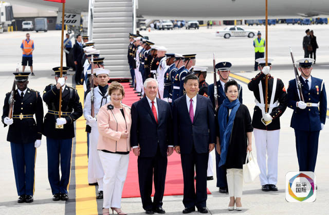 4月6日,國家主席習(xí)近平乘專機(jī)抵達(dá)美國佛羅里達(dá)州,將在海湖莊園同美國總統(tǒng)特朗普舉行中美元首會(huì)晤。習(xí)近平和夫人彭麗媛受到美國國務(wù)卿蒂勒森夫婦等熱情迎接。(新華社記者吳曉凌攝)