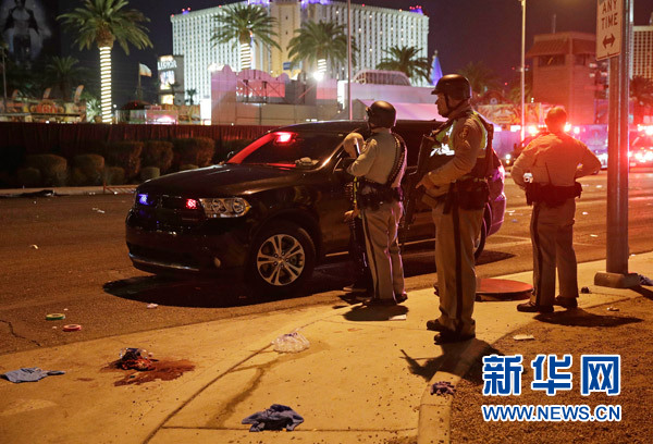 10月2日,在美國(guó)西部城市拉斯維加斯,警察在槍擊事件現(xiàn)場(chǎng)警戒。新華社/美聯(lián)