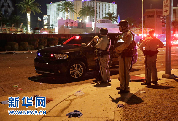 10月2日,在美國西部城市拉斯維加斯,警察在槍擊事件現(xiàn)場警戒。新華社/美聯(lián)