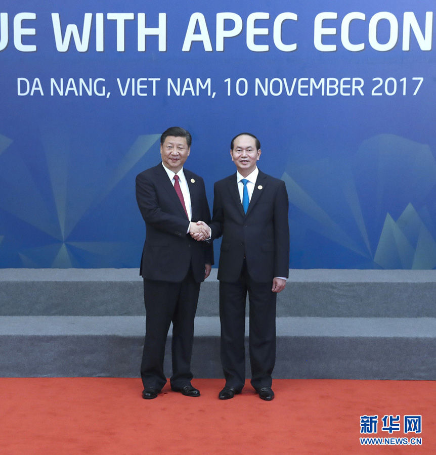 11月10日,國家主席習(xí)近平在越南峴港出席亞太經(jīng)合組織領(lǐng)導(dǎo)人同工商咨詢理事會(huì)代表對話會(huì)。這是對話會(huì)開始前,習(xí)近平受到越南國家主席陳大光的迎接。新華社記者 馬占成 攝