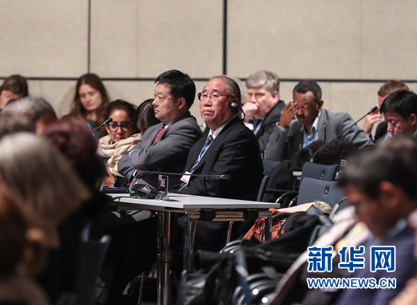11月18日,在德國波恩,中國代表團(tuán)團(tuán)長、中國氣候變化事務(wù)特別代表解振華(中右)出席閉幕會議。新華社記者 單宇琦 攝