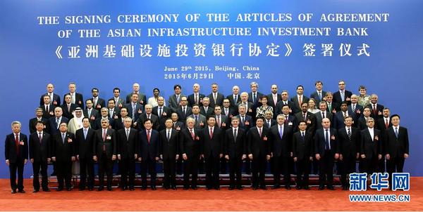 【正式成立】2015年12月25日,歷經800余天籌備,由中國倡議成立、57國共同籌建的亞洲基礎設施投資銀行(亞投行)于當日正式成立,全球迎來首個由中國倡議設立的多邊金融機構。圖為2015年6月29日,國家主席習近平在北京人民大會堂會見出席《亞洲基礎設施投資銀行協(xié)定》簽署儀式的各國代表團團長。