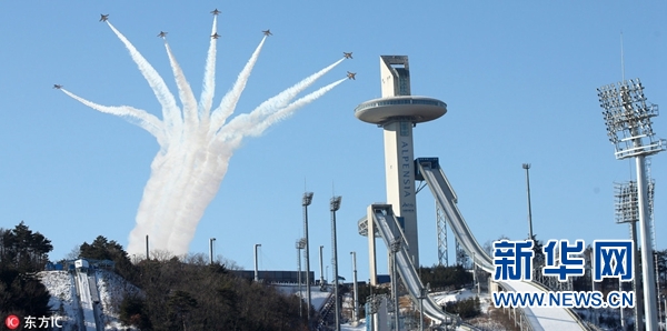 平昌冬奧會(huì)倒計(jì)時(shí)50天 韓黑鷹飛行隊(duì)在空中“畫”出奧運(yùn)五環(huán)(圖)