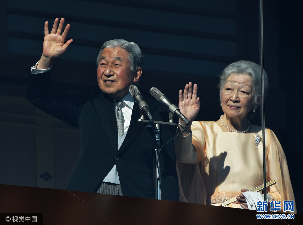 當?shù)貢r間2017年12月23日,日本東京,日本明仁天皇慶祝84歲生日,在皇宮的陽臺上向祝福者揮手致意。(圖片來源:視覺中國)