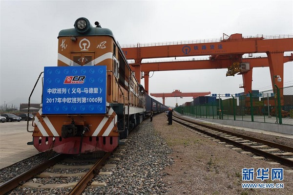 5月13日,2017年第1000列中歐班列從義烏西站駛出。當(dāng)日,X8024次中歐班列(義烏-馬德里)從浙江義烏鐵路西站鳴笛駛出。這列滿載小商品、服裝等貨物的列車(chē)是2017年開(kāi)行的第1000列中歐班列。中國(guó)鐵路總公司統(tǒng)計(jì)顯示,2017年中歐班列開(kāi)行數(shù)量較去年同期增加612列,增長(zhǎng)158%。新華社發(fā)(龔獻(xiàn)明 攝)