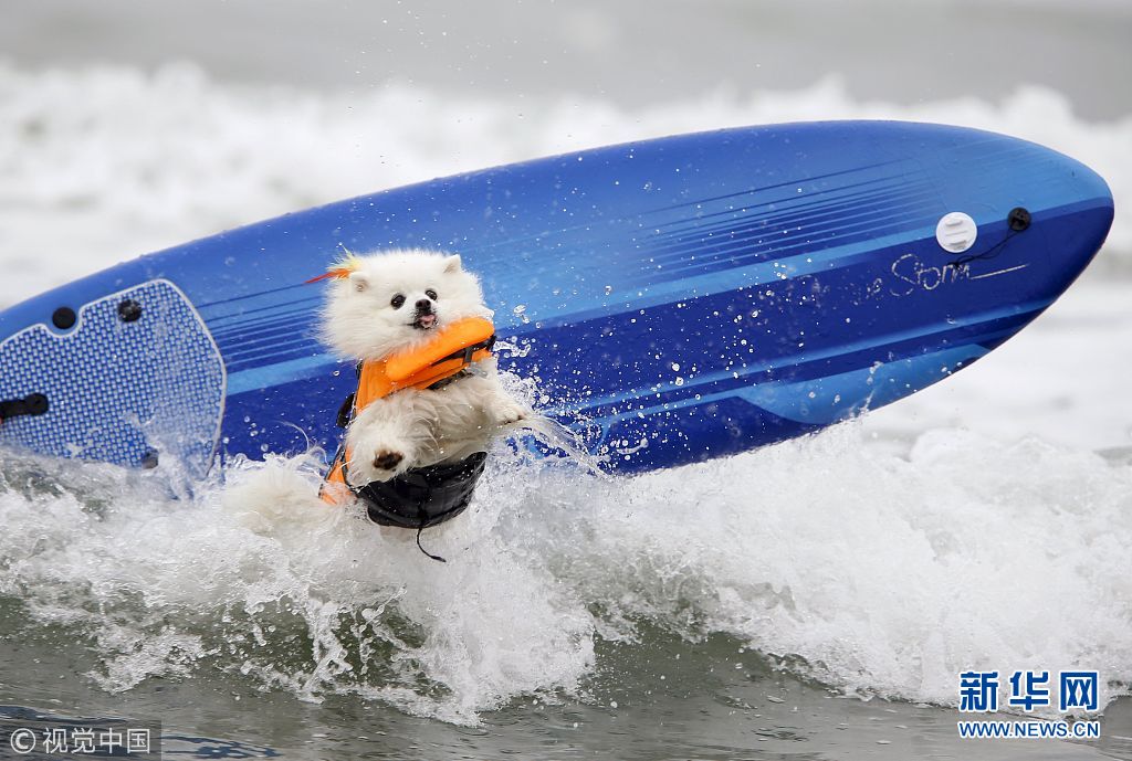 當?shù)貢r間2015年8月1日,美國加利福尼亞州因皮里爾灘舉辦第十屆狗狗沖浪比賽,可愛“汪星人”海浪中展開激烈角逐。(圖片來源:視覺中國)