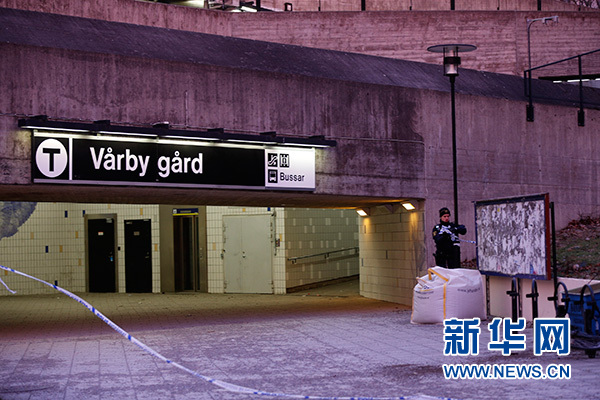 1月7日,在瑞典首都斯德哥爾摩南郊,警察封鎖地鐵站現(xiàn)場。新華社發(fā)(魏學超 攝)