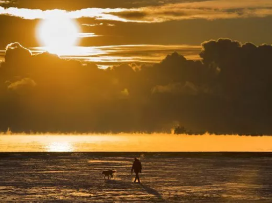 在冰凍的湖面上遛狗,竟然有一種油畫般的詩意美呢。