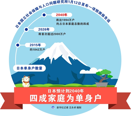 新華社東京1月13日電(記者華義)日本國立社會保障與人口問題研究所12日發(fā)布一項預測報告說,到2040年日本單身戶將占日本家庭總數(shù)的約四成。日本老齡化和獨居現(xiàn)象日益加劇。