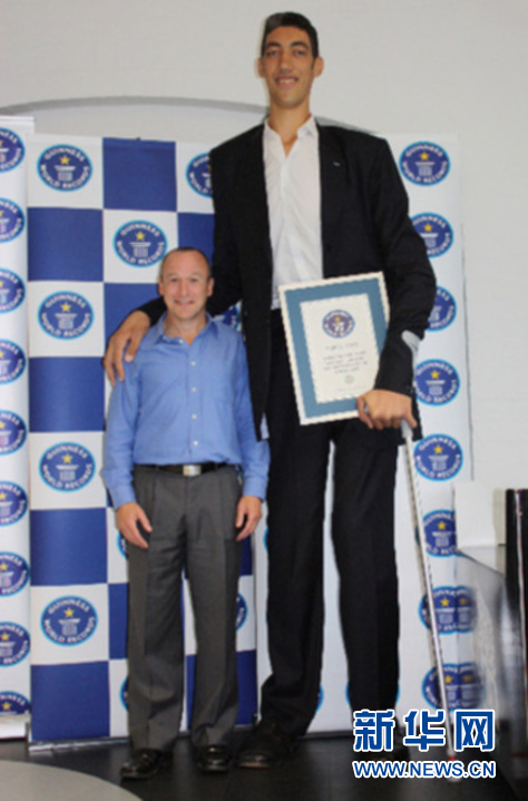 資料圖片:吉尼斯世界紀(jì)錄全球總裁阿里斯塔爾·理查茲(左)與“世界上最高的人(在世)”蘇爾坦(土耳其籍)合影。(吉尼斯世界紀(jì)錄供圖)