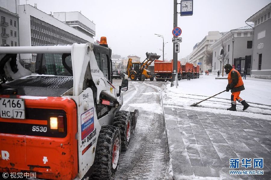 當(dāng)?shù)貢r間1月20日,俄羅斯莫斯科,工作人員在清理街道上的積雪。 (圖片來源:視覺中國)