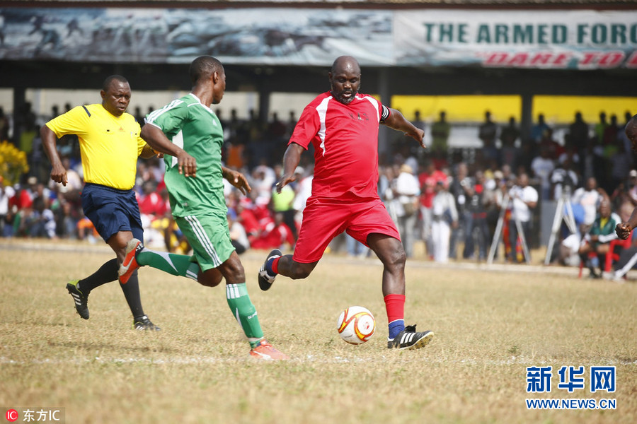 1月20日,利比里亞首都蒙羅維亞,利比里亞當(dāng)選總統(tǒng)、前世界足球先生喬治-維阿參加慈善足球比賽,率領(lǐng)維阿全明星隊(duì)對(duì)戰(zhàn)利比里亞武裝部隊(duì)士兵隊(duì)。喬治-維阿在去年12月27日當(dāng)選利比里亞新一任總統(tǒng),并將于2018年1月22日就職。(圖片來(lái)源:東方IC)