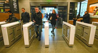 Amazon Go占地約167平方米,包括員工在內(nèi)可容納97人。進(jìn)入店內(nèi)購(gòu)物前,先要下載相關(guān)智能手機(jī)應(yīng)用,并通過(guò)手機(jī)掃碼進(jìn)入一個(gè)類(lèi)似于地鐵站的閘機(jī)口。進(jìn)入店內(nèi),首先映入眼簾的是可以直接食用的午餐食品,接著是肉類(lèi)和餐具等雜貨。借助天花板上的大量黑色攝像頭和貨架上的重量傳感器,店方能探測(cè)何人取走了貨物。如果有人拿著商品走出閘門(mén),其關(guān)聯(lián)賬號(hào)就會(huì)扣費(fèi)。反之,如果消費(fèi)者把商品放回貨架,商品則從虛擬購(gòu)物車(chē)中刪除。顧客購(gòu)物結(jié)束后直接通過(guò)閘機(jī)口離店,幾分鐘后將收到亞馬遜發(fā)送的電子收據(jù)。