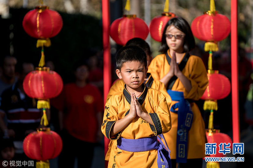 當?shù)貢r間1月28日,美國洛杉磯,當?shù)谿rove商場舉行少林武術表演以及其他中國文化類的演出,慶祝傳統(tǒng)新年,場外攤位還有傳統(tǒng)剪紙,捏面人,糖畫,彩繪等項目。圖為少林功夫表演。(圖片來源:視覺中國)