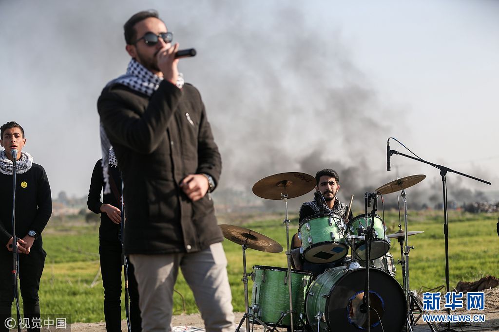 當?shù)貢r間2月2日,加沙,巴勒斯坦示威者與以色列士兵發(fā)生沖突;一巴勒斯坦樂隊在沖突中開音樂會。 (圖片來源:視覺中國)