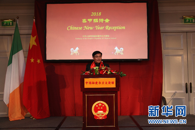 2月8日, 在愛(ài)爾蘭首都都柏林, 中國(guó)駐愛(ài)爾蘭大使岳曉勇在春節(jié)招待會(huì)上致辭。新華網(wǎng)發(fā)(張琪攝)