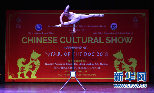 2月9日,在印度首都新德里,2018“歡樂春節(jié)”活動演出現(xiàn)場,中國演員在表演雜技。新華網(wǎng)發(fā)(張迺杰攝)
