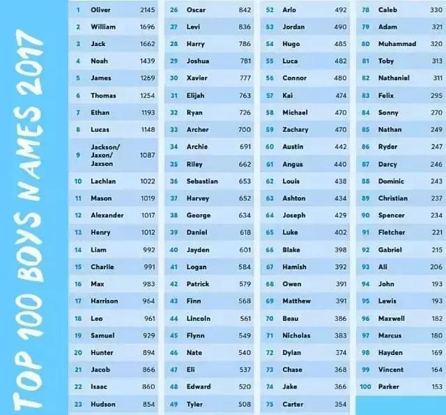 下面這些,可是2017年外國人最愛的英文名字,